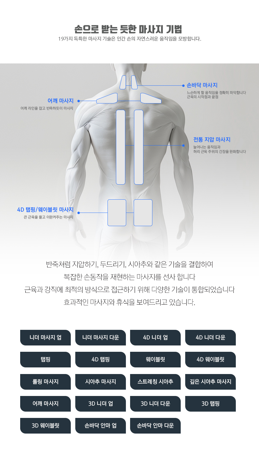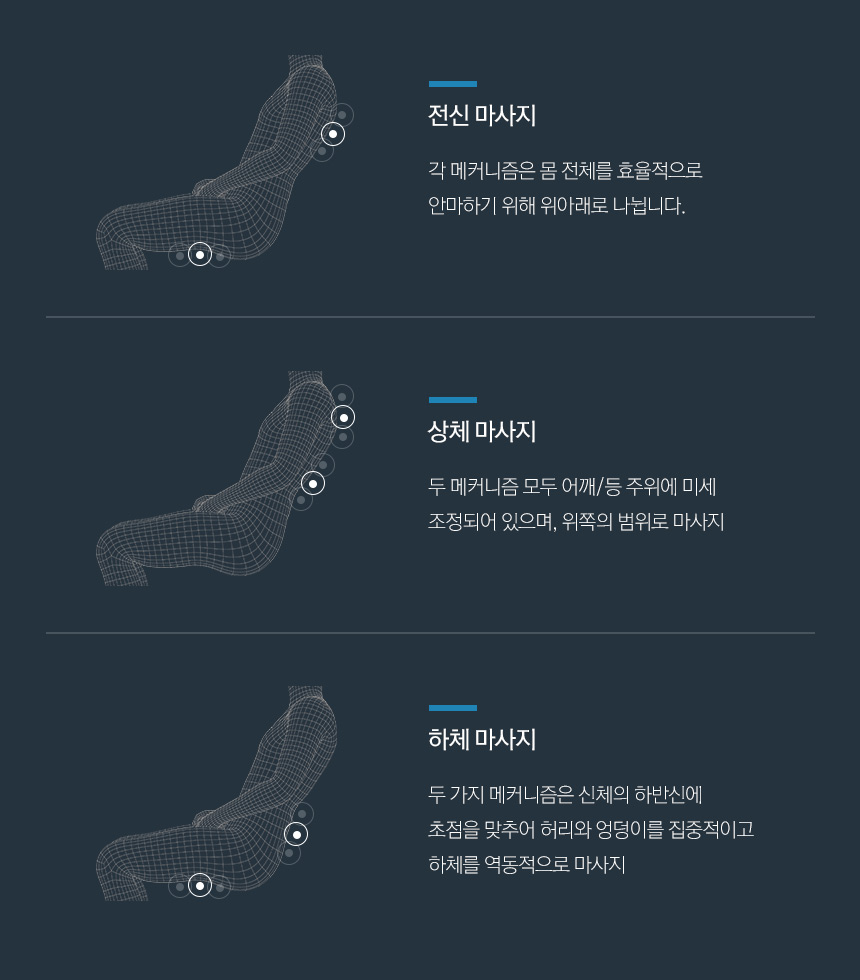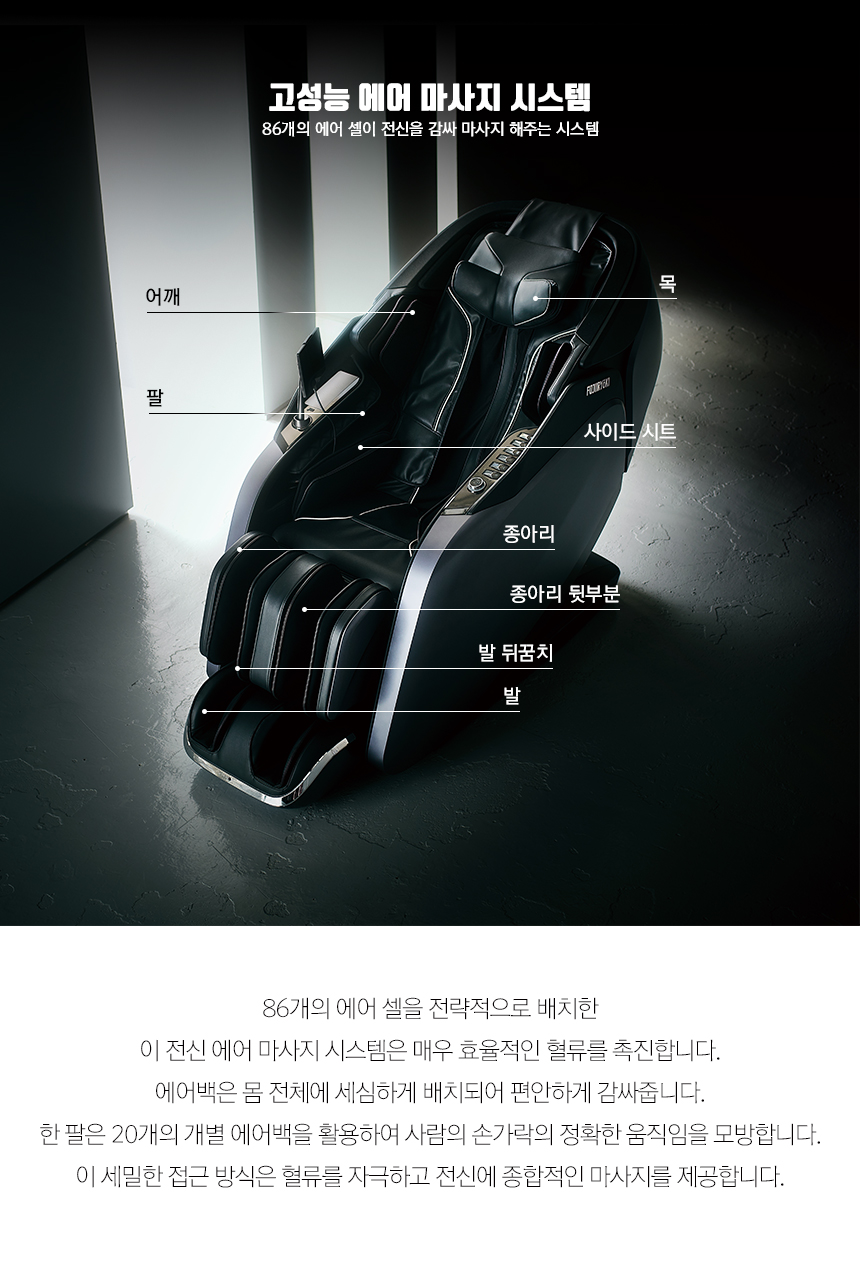 본 제품은 기존 안마 의자의 기능을 혁신적으로 개선한 프리미엄 안마 의자로, 차별화된 특징을 제공합니다.